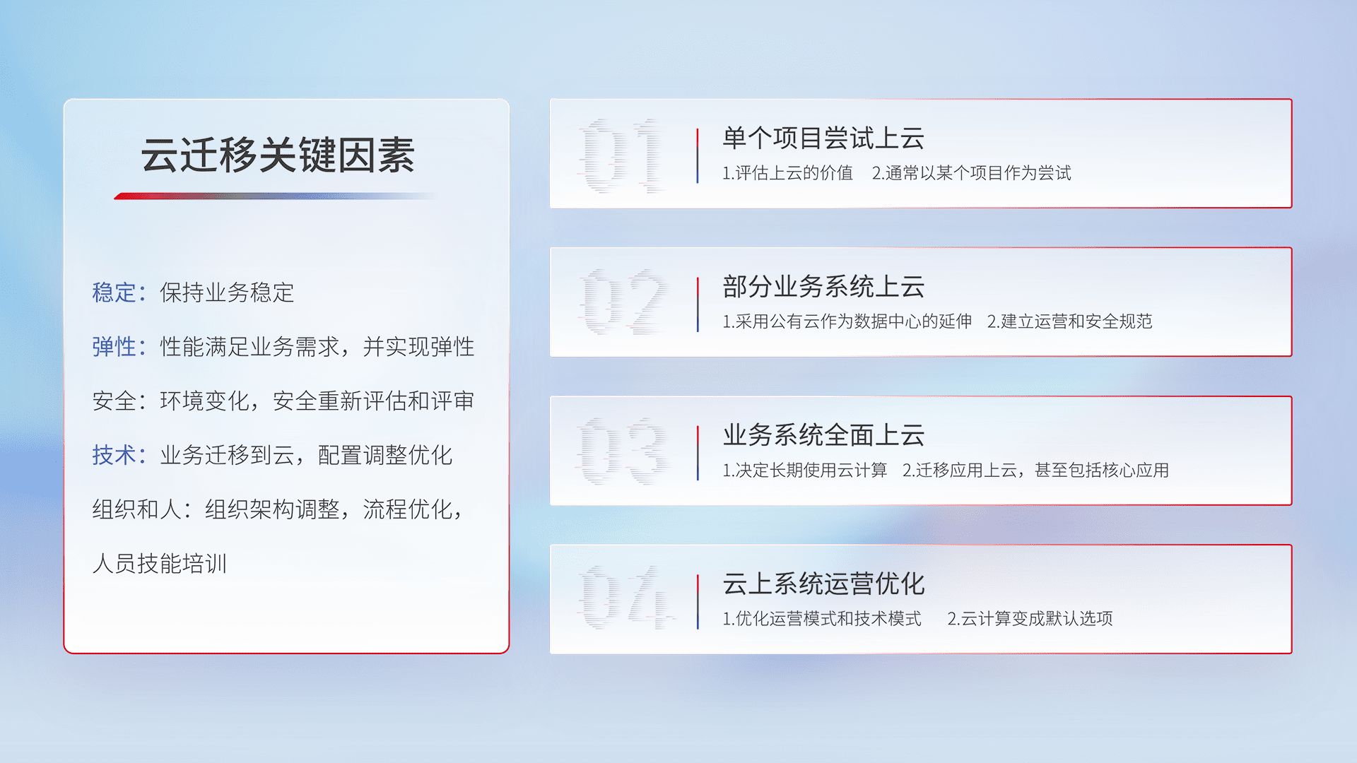 结合实际业务,,,从规划设计、、、、云平台选型、、云原生改造、、数据迁移、、、、集成交付,,,迁移全过程为客户识别最佳上云路径,,,做好风险识别管理,,,,设计网络架构、、、、身份权限、、、、安全审计合规、、、操作审计、、日志审计、、监控告警策略、、多站点容灾设计等,,对云上基础设施进行整体规划,,提升IT治理水平,,,,以满足弹性、、、高可用、、、高性能的需求。。。