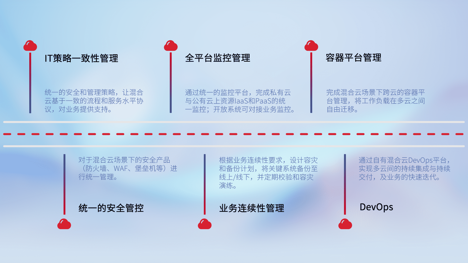 通过多云纳管,,,,以统一的资源数据模型把客户的云资源进行抽象和封装,,,进而实现对多云资源的统一操作,,保障云资源管理的可靠性、、、稳定性与可用性。。。。量身定制化运维内容,,配置、、、开发运维、、补丁管理、、、备份、、监控、、、、认证和访问管理、、、审计和日常巡检等,,保障在用云过程中的可靠度,,稳定度以及高可用率。。。