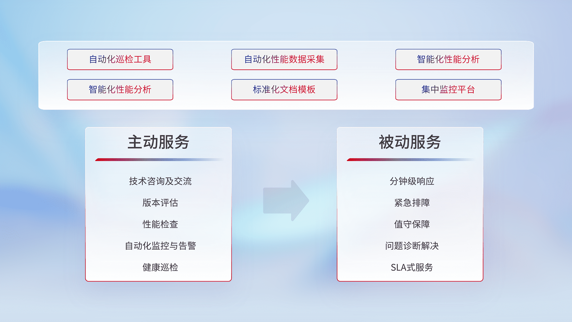 智能化工具和标准化文档,,保障服务质量,,,提供主动服务(包含技术咨询、、、版本评估、、性能检查、、、、自动化监控与告警、、、健康巡检)和被动服务包含(分钟级响应、、、、紧急排障、、值守保障、、问题诊断解决、、SLA服务)。。